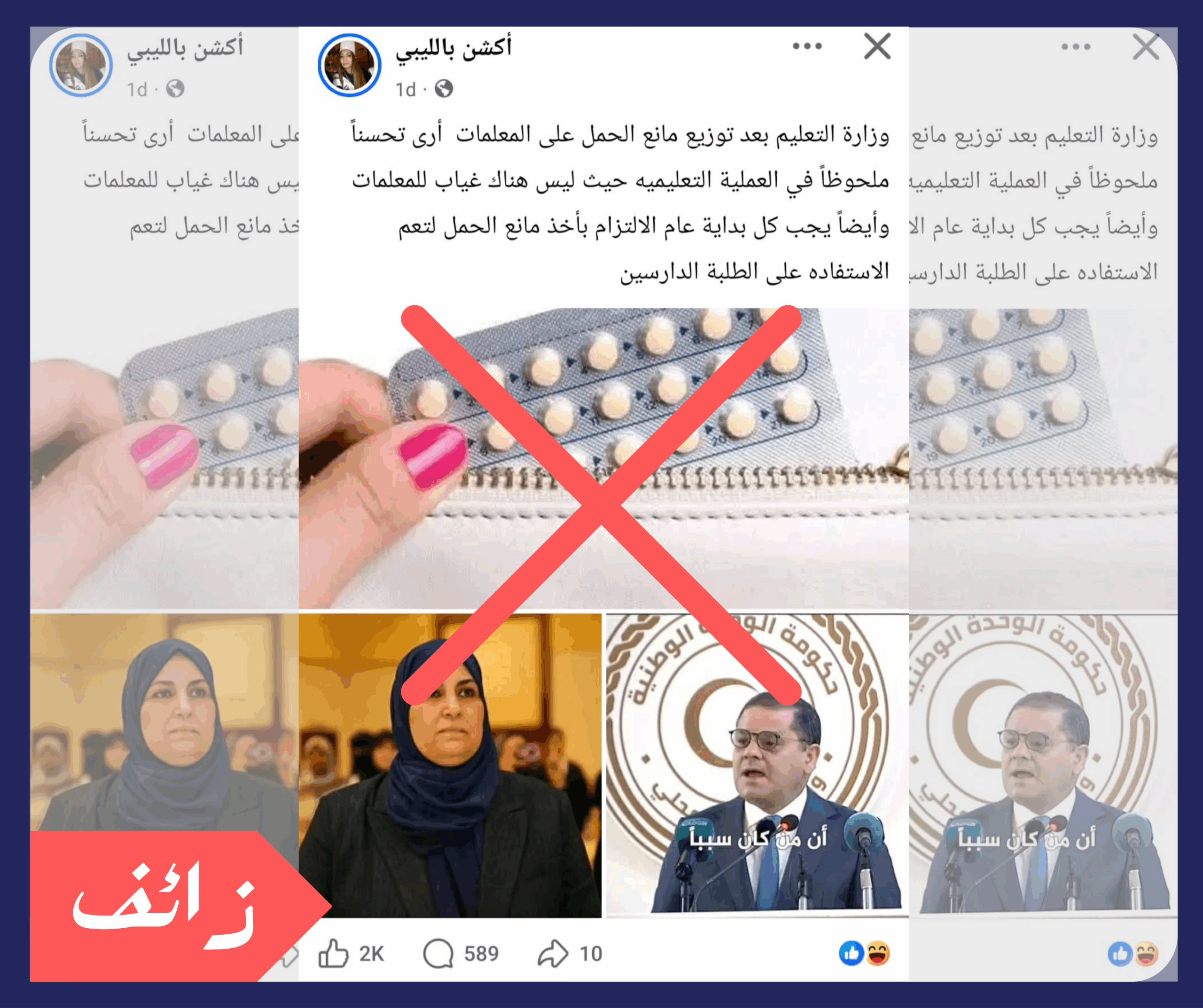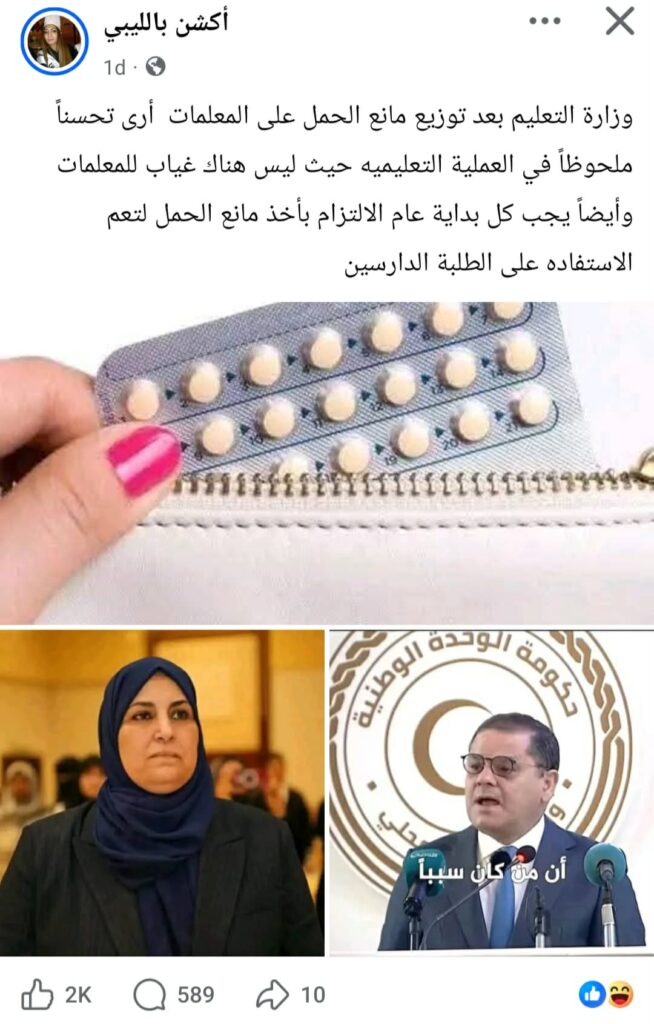 تداولت صفحات وحسابات على موقع فيسبوك منشوراً يدّعي قيام وزارة التربية والتعليم الليبية بتوزيع حبوب منع الحمل على المعلمات، مدعياً حدوث تحسن في العملية التعليمية نتيجة لذلك.