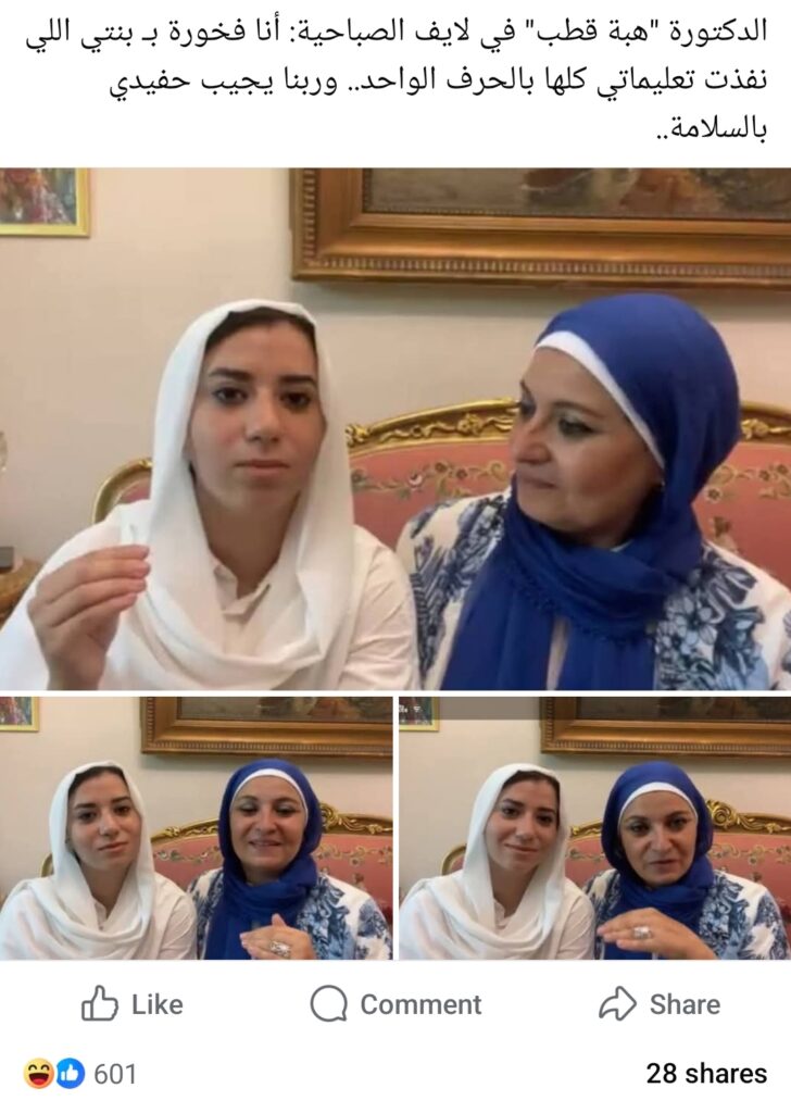 تداولت صفحات على موقع فيسبوك صورًا تجمع الدكتورة هبة قطب بابنتها، مرفقة بتعليق زعم أنه من بث مباشر حديث قالت فيه: «فخورة ببنتي اللي نفذت تعليماتي بالحرف الواحد.. وربنا يجيب حفيدي بالسلامة».
