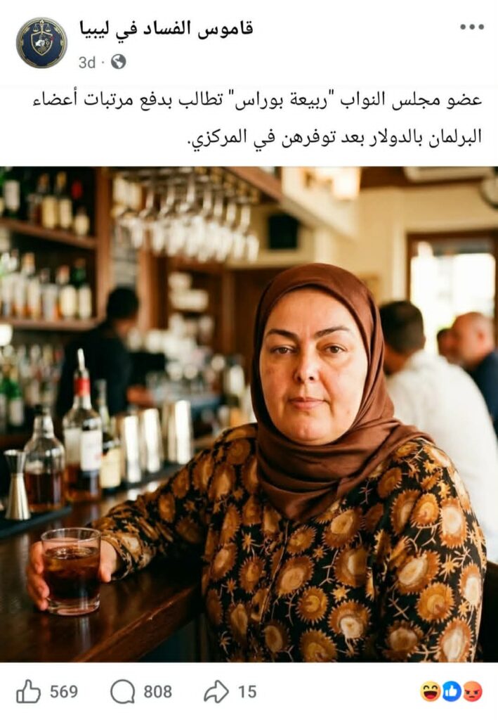 تداولت صفحات وحسابات على موقع فيسبوك صورة تُظهر النائبة في مجلس النواب الليبي “ربيعة بوراس” وهي تحمل مشروبا كحولياً.