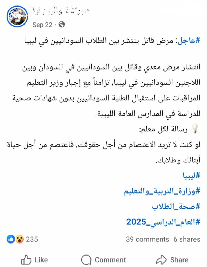 تداولت صفحات وحسابات على فيسبوك ادعاءً يزعم انتشار مرض قاتل بين الطلاب السودانيين في ليبيا، نُسب إلى وزارة التربية والتعليم الليبية.