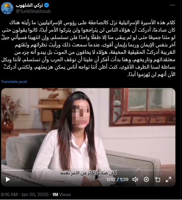 نشرت صفحة تحمل اسم “تركي الشلهوب”، على منصة اكس و التي يتابعها أكثر من مليون شخص، مقطع فيديو بتاريخ 30/01/2025، يزعم أن إحدى الأسيرات الإسرائيليات المفرج عنهن أدلت بتصريحات تؤكد تمسك حركة حماس بالمقاومة مهما كان الثمن. وقد حصد الفيديو تفاعلا واسعا تمثل في مليون مشاهدة في فترة وجيزة و أكثر من 4 آلاف إعادة مشاركة للمقطع.
