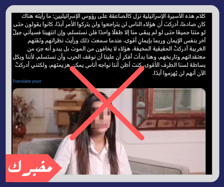نشرت صفحة تحمل اسم “تركي الشلهوب”، على منصة اكس و التي يتابعها أكثر من مليون شخص، مقطع فيديو بتاريخ 30/01/2025، يزعم أن إحدى الأسيرات الإسرائيليات المفرج عنهن أدلت بتصريحات تؤكد تمسك حركة حماس بالمقاومة مهما كان الثمن. وقد حصد الفيديو تفاعلا واسعا تمثل في مليون مشاهدة في فترة وجيزة و أكثر من 4 آلاف إعادة مشاركة للمقطع.