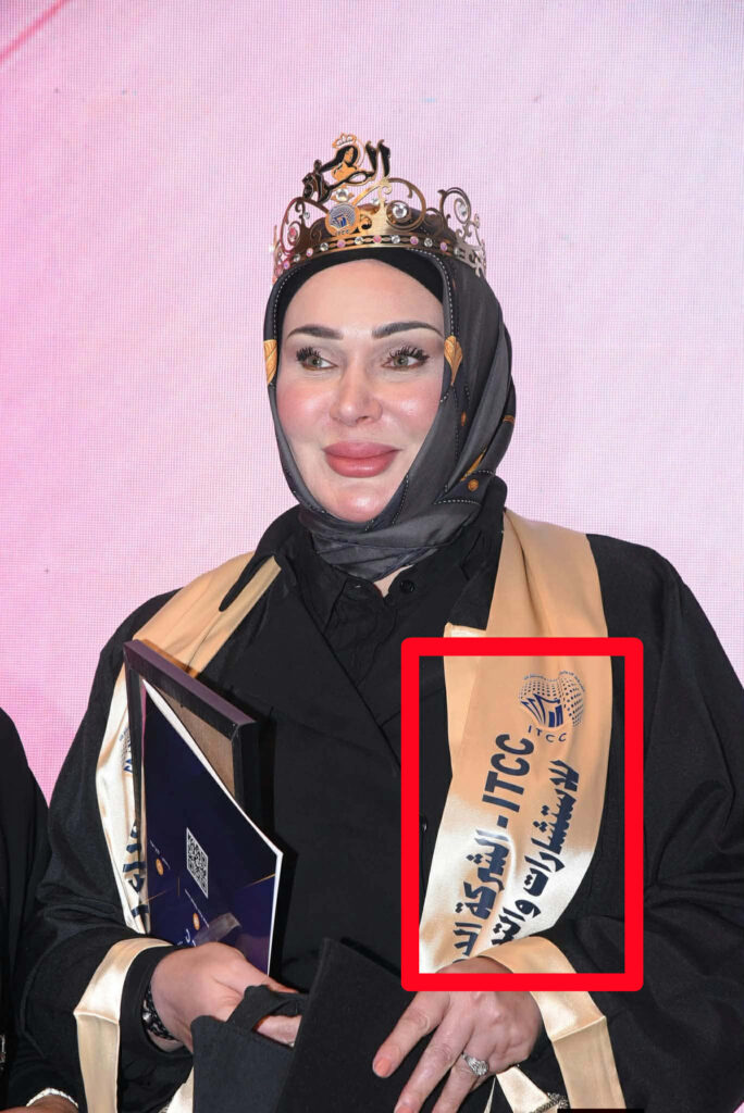 وجود شعار الشركة الدولية للاستشارات والتدريب على وشاح التكريم الذي ترتديه النائبة