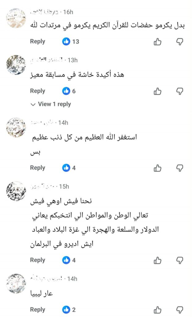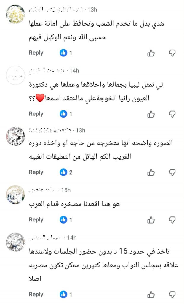 أظهرت تعليقات مستخدمي فيسبوك غضبًا واسعًا، حيث ركزت أغلب التعليقات على اتهامها بإضاعة وقتها في فعاليات “تافهة” بدلًا من خدمة الشعب الليبي الذي يعاني أوضاعًا معيشية صعبة.