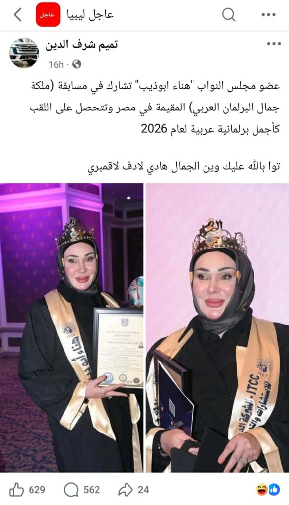 تداولت صفحات وحسابات على فيسبوك ادعاءً مفاده حصول النائبة الليبية “هناء أبو ذيب” لقب أجمل برلمانية عربية لعام 2026.