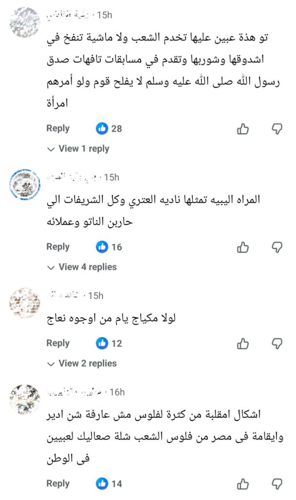 كما تضمنت التعليقات انتقادات حادة لصورتها الشخصية، واتهامات لها بالسفر إلى مصر “على حساب الشعب” وحضور فعاليات لا علاقة لها بعملها النيابي.